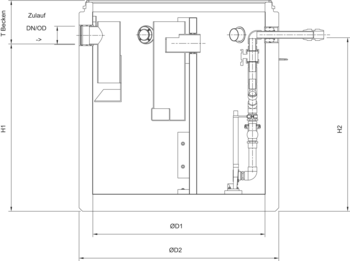 - Bereich unterhalb der Trennwand: Platzreserve für eine bauseitige Rückstauschleife DN 50 – 200, mit Heizung 100 W mit Thermostat