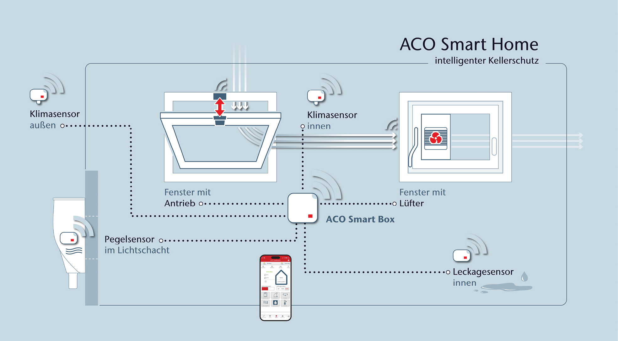 Das ACO Smart Home-System intelligenter Kellerschutz berechnet die absolute Feuchte anhand von Sensordaten innen und außen und lüftet dann nur, wenn die absolute Feuchte im Keller reduziert werden kann.