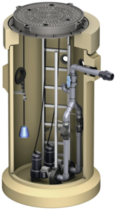 Mit der Pumpstation ACO Powerlift Pro gehören kostenintensive Sanierungen der Vergangenheit an. Beim ACO Polymerbetonschacht besteht der monolithische Pumpenraum sowie der komplette Schachtaufbau aus Polymerbeton. Durch die Verklebung der Teile miteinander entsteht ein komplett dichtes Schachtsystem. Ein weiterer Vorteil liegt in dem leichten Handling sowie der besonderen Beständigkeit gegen Frost- und Korrosionseinwirkung. Die glatte Oberfläche des Polymerbetons erleichtert Reinigungsarbeiten und bietet Schmutzablagerungen kaum Möglichkeiten. Das harzgebundene Schachtbauwerk ist beständig gegen biogene schweflige Säure im Abwasser. Die Armaturen der Pumpen, z. B. Unterwasserkupplung, Kugelrückschlagventil und die Pumpen selbst, bestehen aus langlebigem Grauguss. Die Druckleitung und der Kugelabsperrschieber werden aus dem Werkstoff PVC-U gefertigt, der eine ausgezeichnete chemische Beständigkeit aufweist und absolut korrosionsbeständig ist. Der Einbau ist bis zu einer Gesamteinbautiefe von 4,5 m möglich.