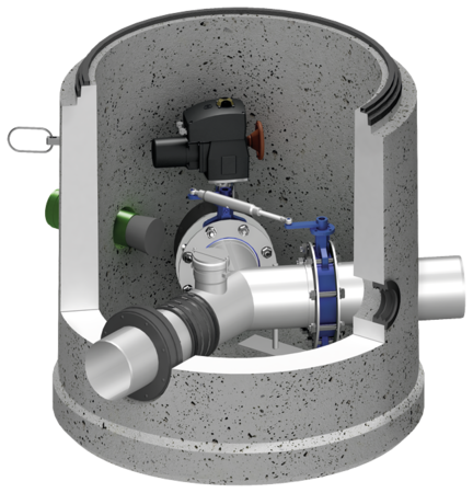 Der ACO Umschaltschacht dient zur getrennten Ableitung von unterschiedlich belasteten Abwasserteilströmen. Die Umschaltung erfolgt über zwei Absperrklappen mit einem elektrischen Schwenkantrieb.