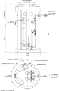 - 1 Zulauf DN/OD 160 (Maß Oberkante des Schachts bis Unterkante Zulauf: 1325 mm)