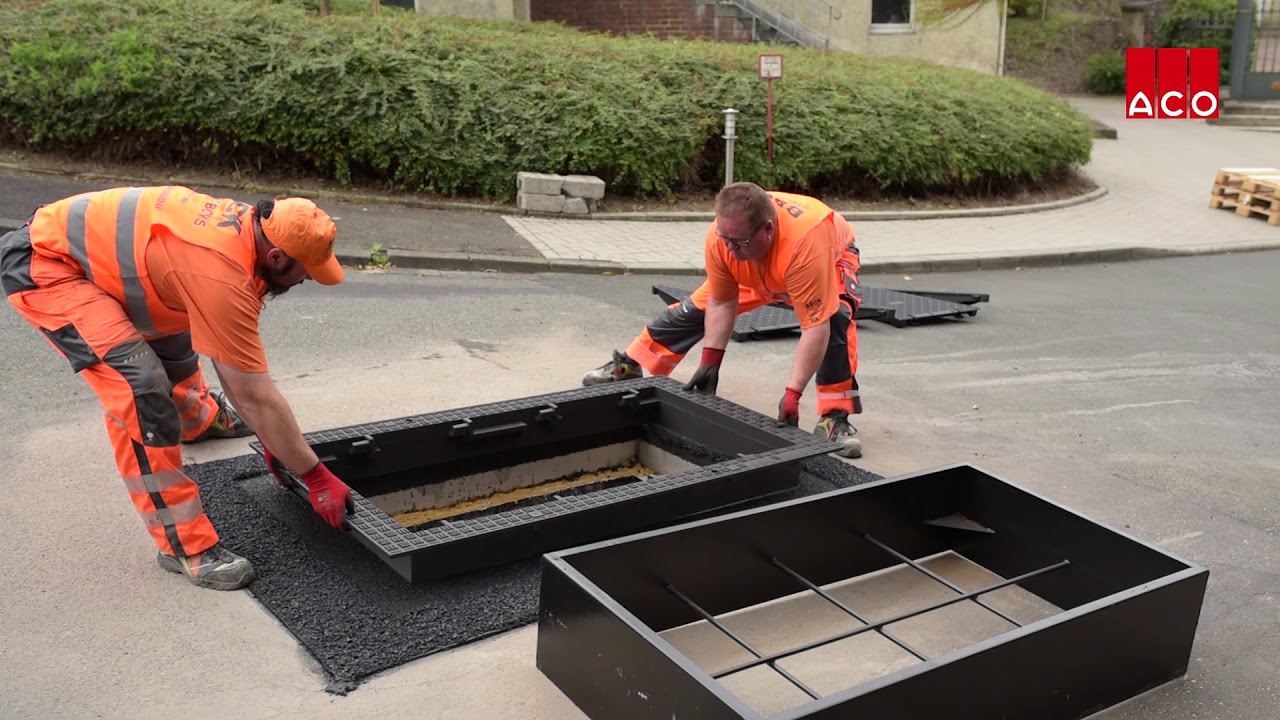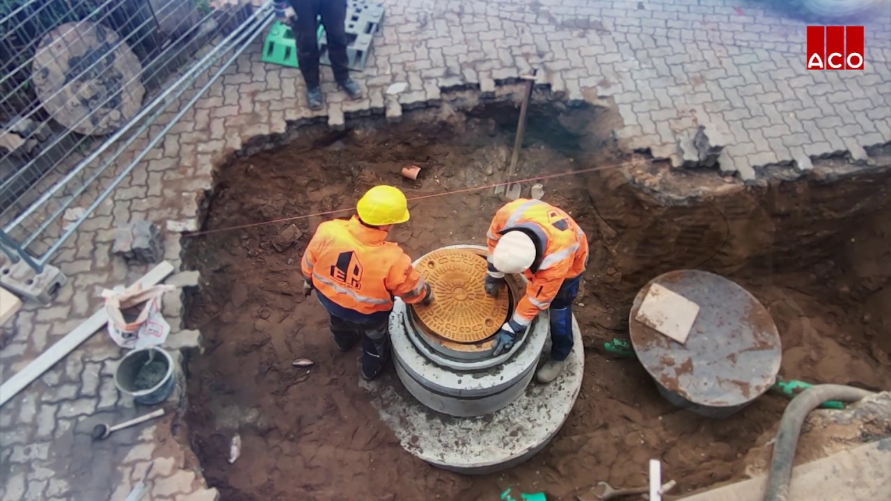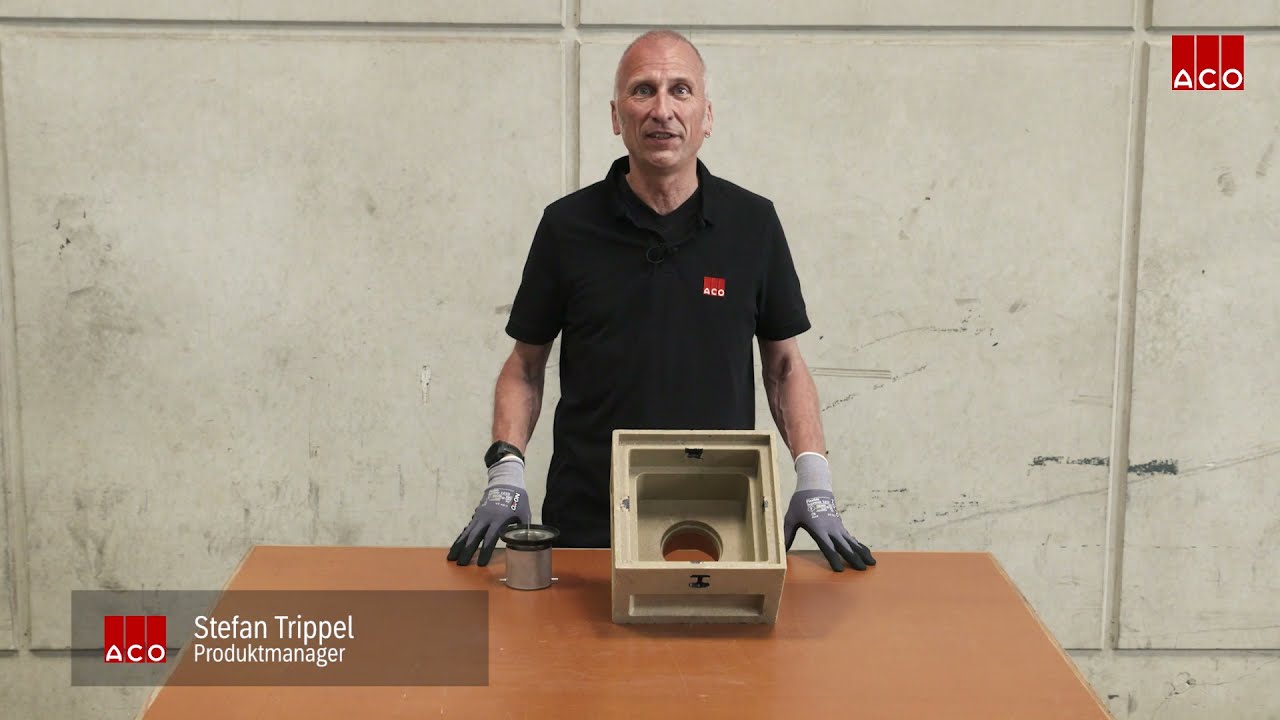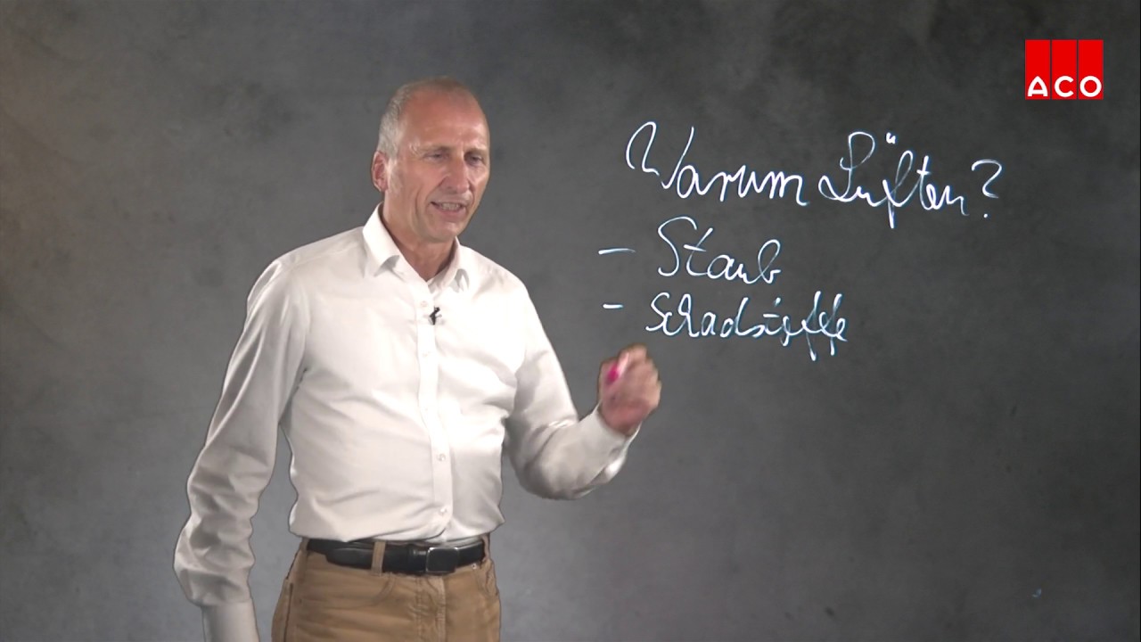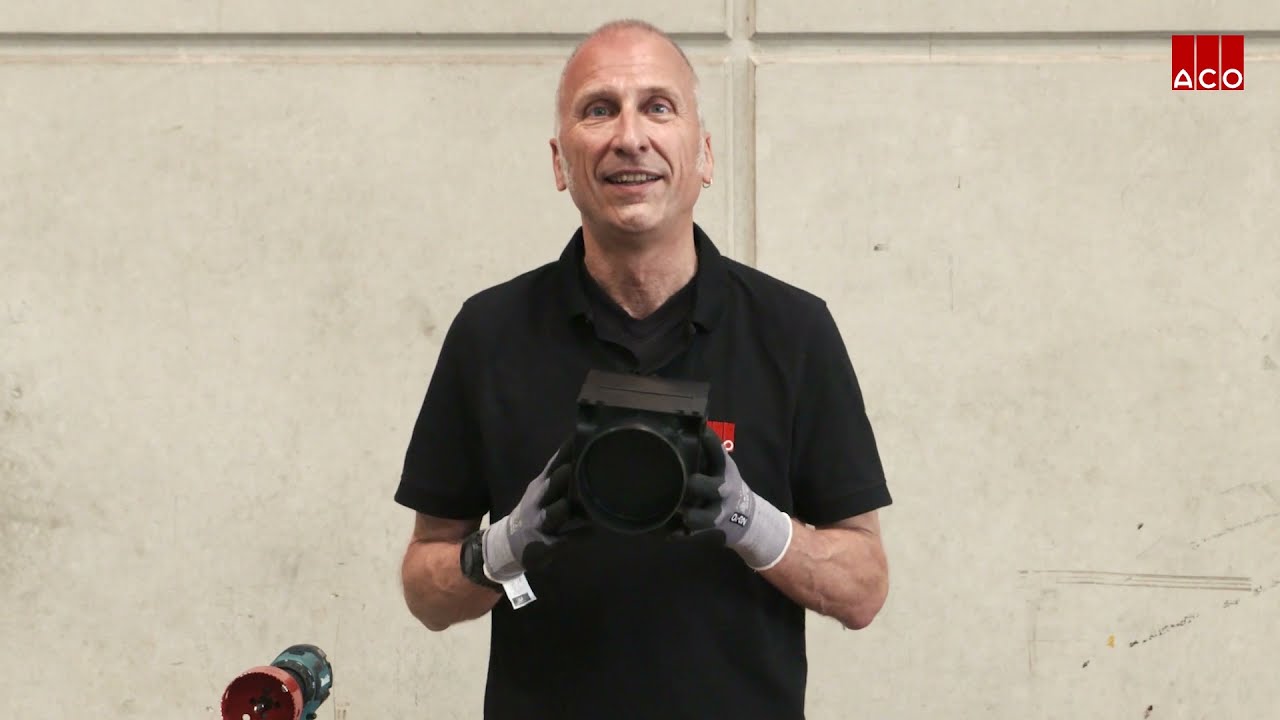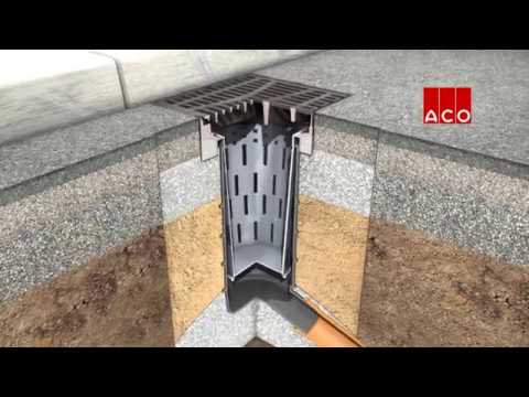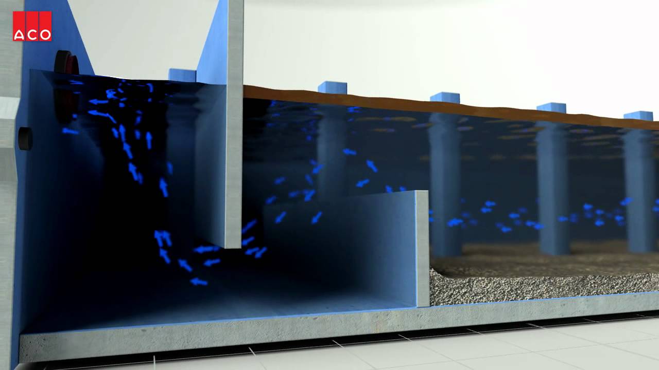 Erfahren Sie mehr zur Funktionsweise: Sehen Sie, wie das Oberflächenwasser von der ACO DRAIN® Monoblock Rinne aufgenommen und in den 3-Kammer-Tauchwandschacht fließt. Innerhalb des Systems gelangt das Wasser in den Schlammfang, wo sich die Sedimente ablagern können, dann über die Tauchwand, um anschließend gereinigt von Grobstoffen in die Rohrleitung abzuleiten.