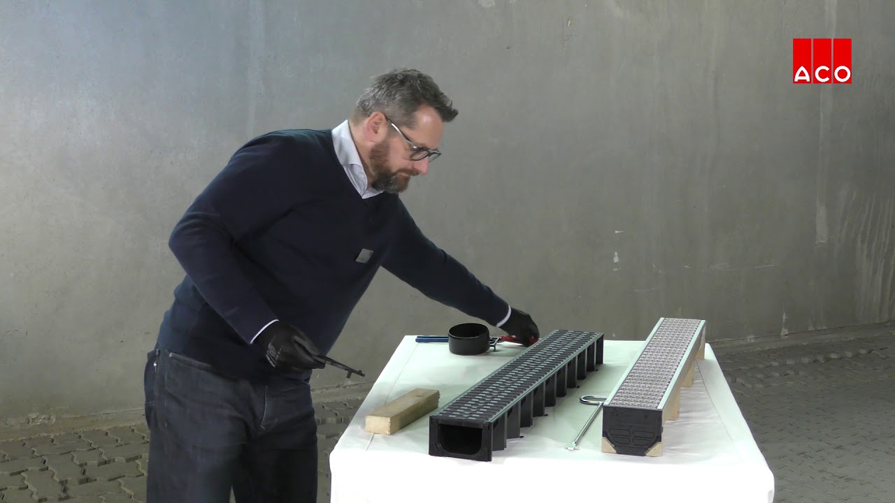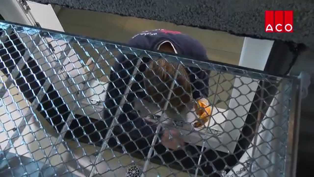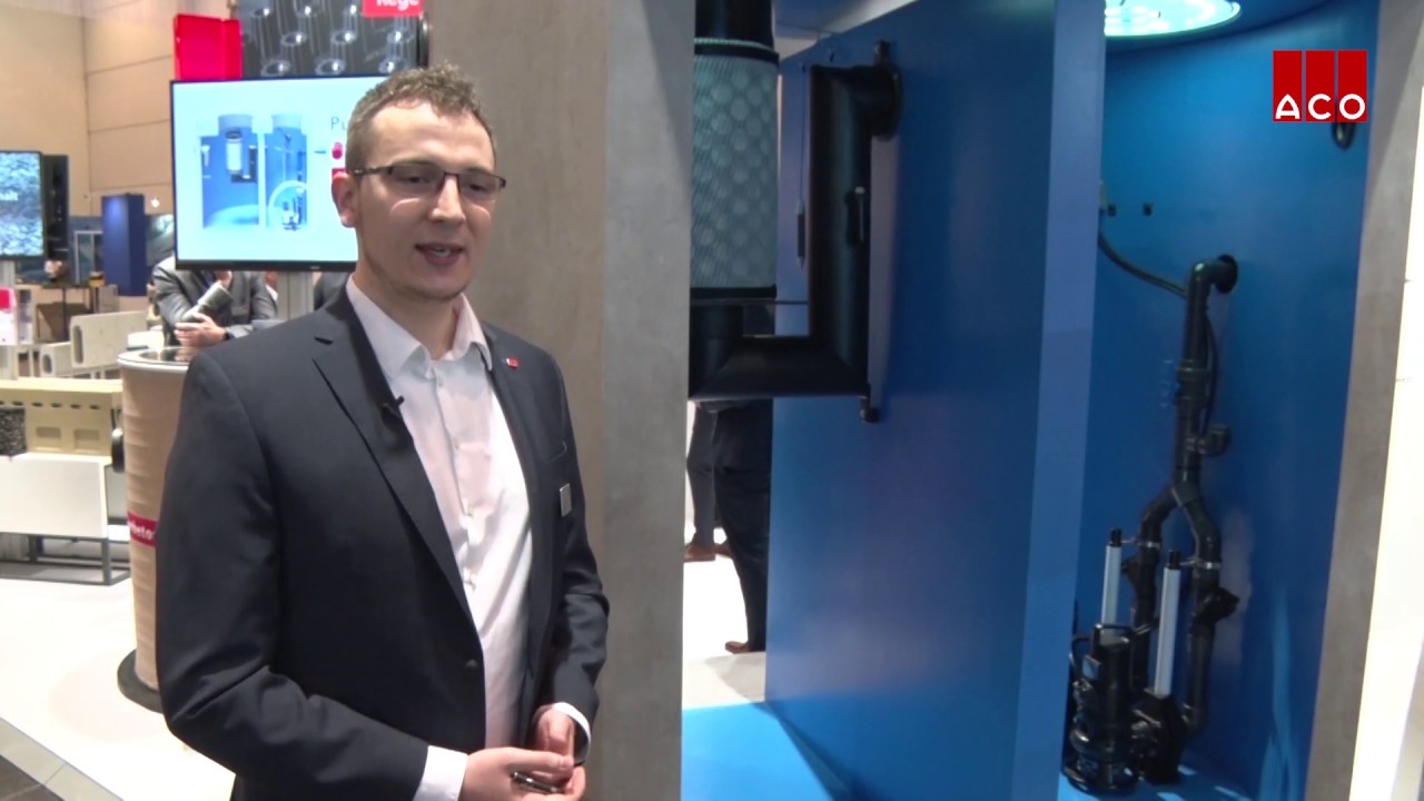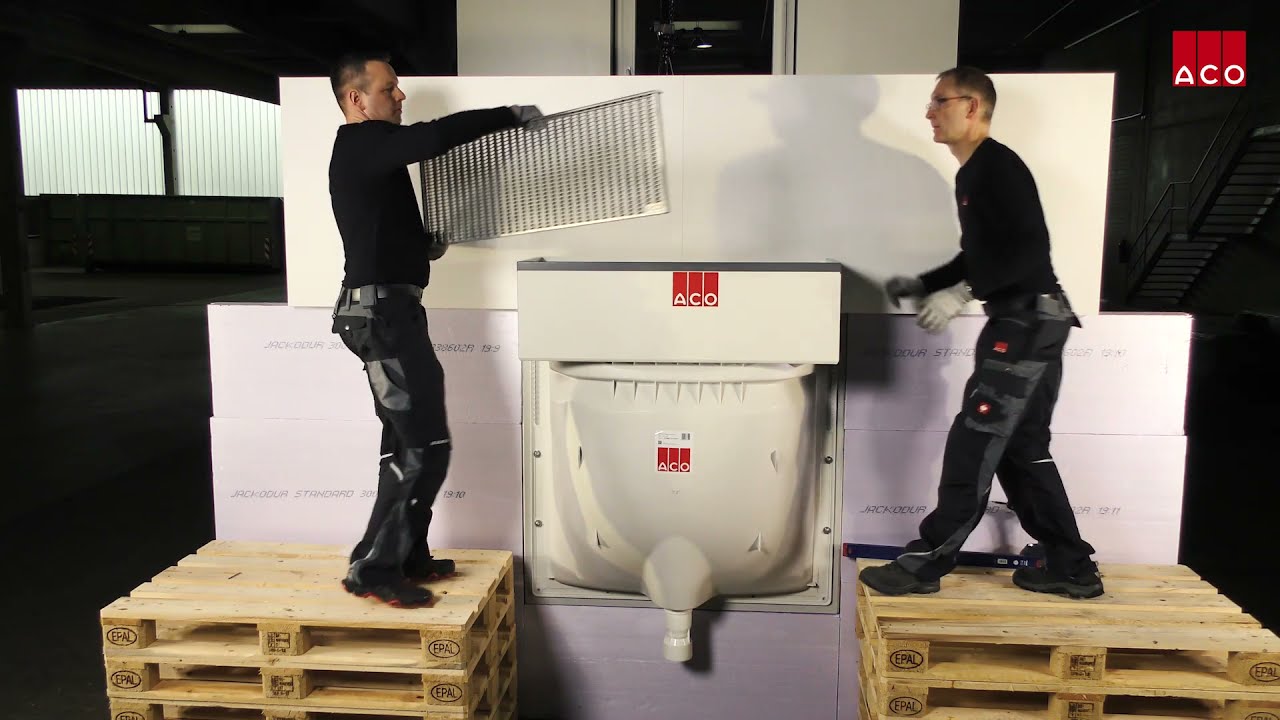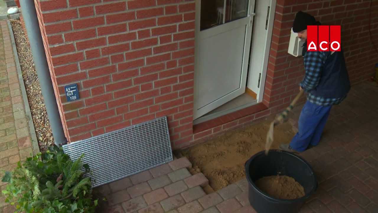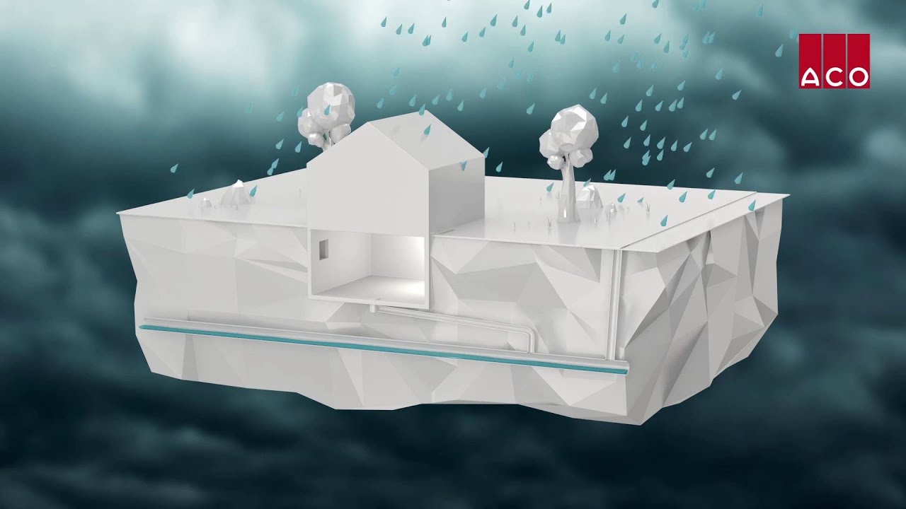 Erfahren Sie mehr zur Funktionsweise: Sehen Sie, wie das Oberflächenwasser von der ACO DRAIN® Monoblock Rinne aufgenommen und in den 3-Kammer-Tauchwandschacht fließt. Innerhalb des Systems gelangt das Wasser in den Schlammfang, wo sich die Sedimente ablagern können, dann über die Tauchwand, um anschließend gereinigt von Grobstoffen in die Rohrleitung abzuleiten.